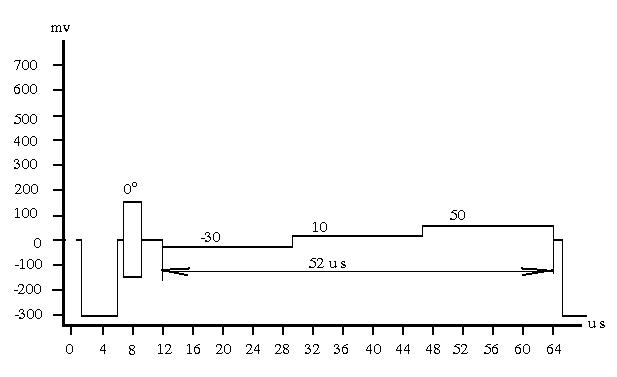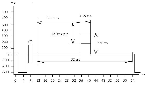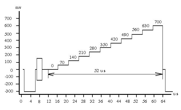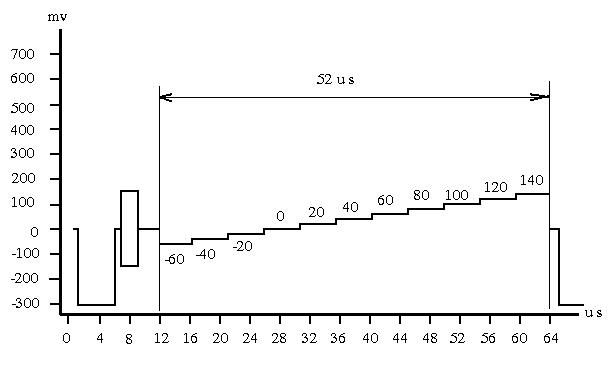 11 阶亮度信号是11个亮度电平从0电平以相等的 电平间隔向 正电平变 化的亮度信号,是一种行频信号。 阶梯电平:0mV,70mV,140mV,210mV,280mV,350mV,420mV, 490mV ,560mV,620mV,700mV 电平误差:±4mV 电平基准:以消隐电平为0mV 各种行频信号显示在接收机上的位置